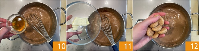 Adicione o licor de amaretto 10, depois a manteiga 11 e deixe derreter. Neste ponto, adicione os amaretti esfarelados com as mãos 12.