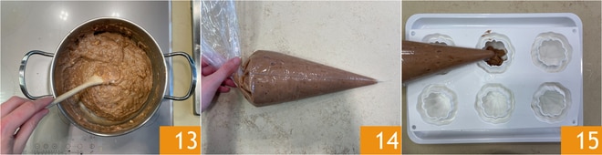 Misture novamente 13 e transfira a mistura para um saco de confeitar 14, depois encha as formas de pudim de silicone 15. As doses se referem a 4 formas de 150 g.