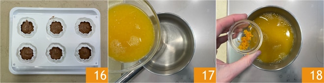 Coloque no freezer por 6 horas 16. Prepare o molho de laranja: em uma panela, despeje o suco de laranja 17 e a casca 18 e aqueça.