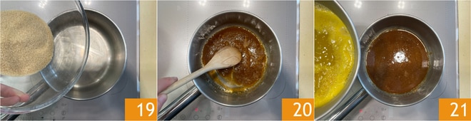 Simultaneamente, em outra panela, despeje o açúcar mascavo 19 e deixe derreter em fogo baixo 20. Agora, junte o suco aquecido ao caramelo em três vezes 21.
