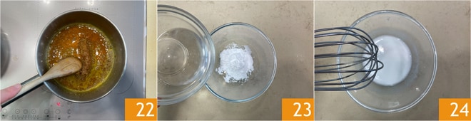 Deixe ferver 22 e, enquanto isso, em uma tigela, junte o amido e o licor de laranja 23, misture com o batedor 24