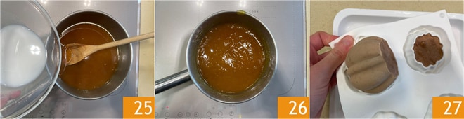 Incorpore o amido no caramelo 25, mexa e deixe esfriar 26. Uma vez que os pudins estejam firmes, desenforme-os 27 e coloque-os em um prato de servir.