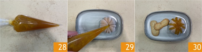 Transfira o molho de laranja resfriado para um saco de confeitar 28 e decore os pudins 29, complete com línguas de gato de pistache 30