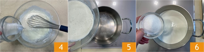 Despeje aos poucos o leite, mexendo 4, e depois transfira a mistura para uma panela no fogo 5, adicione o açúcar refinado 6.