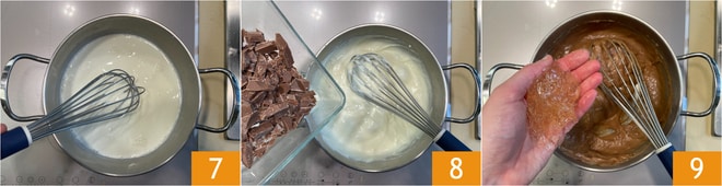 Quando atingir a ebulição, cozinhe por mais 1 minuto, sempre mexendo 7. Em seguida, desligue o fogo e adicione o chocolate gianduia 8, misture bem para derretê-lo. Incorpore a gelatina previamente amolecida em água e escorrida 9.