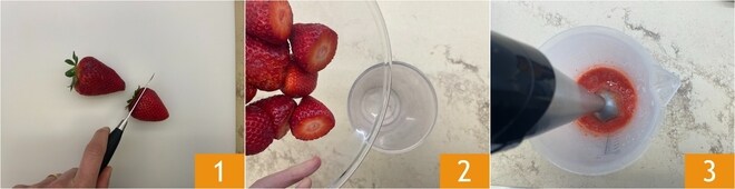 Para preparar o pudim de morango, a primeira coisa é lavá-los e secá-los bem. Corte a parte superior com as folhas, usando uma faquinha 1 e transfira-os para um recipiente alto e estreito 2. Bata com um mixer de imersão até obter um purê 3.
