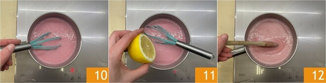 Misture bem para evitar grumos 10 e ligue o fogo. Adicione também o suco de meio limão 11. Cozinhe em fogo médio, mexendo sempre, até começar a ferver e engrossar 12.