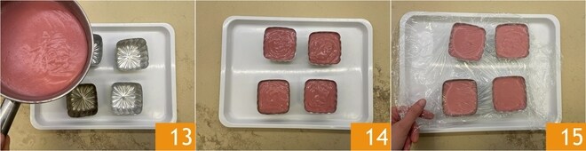Molhe com água 4 forminhas grandes de 7x7 cm e 4 cm de altura. Despeje o composto dentro 13 até a borda 14. Cubra com filme plástico e deixe solidificar na geladeira por pelo menos 2 horas.