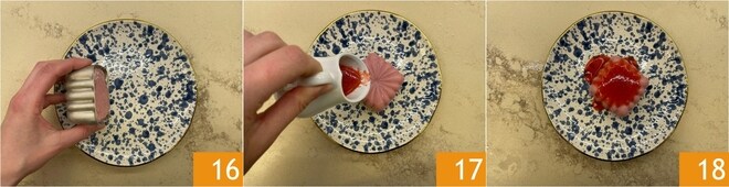 Desenforme os pudins em um pratinho 16, para facilitar, você pode molhar o fundo da forma com água quente. Decore com a calda de morango reservada 17 e sirva 18.