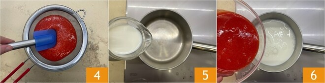Coe o composto obtido para eliminar as sementes 4. Em uma panela, despeje o leite 5 e 300 g de purê de morango 6, reserve o restante do purê na geladeira bem coberto, será usado para a decoração final.