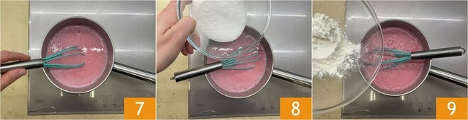 Misture com um batedor 7, em seguida, adicione também o açúcar 8 e o amido 9.