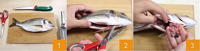 Coloque o peixe em uma tábua de corte e comece a eviscerá-lo: com a tesoura, faça um corte na barriga e siga em linha reta até embaixo da cabeça 2, depois retire as vísceras com as mãos e elimine-as 3.