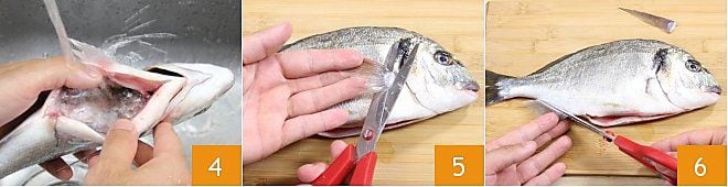 Lave bem a barriga do peixe em água corrente para remover qualquer vestígio de sangue restante 4. Agora remova as barbatanas: com a tesoura, corte primeiro a barbatana lateral situada perto da cabeça 5, depois corte a barbatana caudal situada abaixo da barriga 6