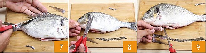 e a dorsal 7. Vire o peixe do lado oposto e remova a outra barbatana lateral 8 e a caudal 9.