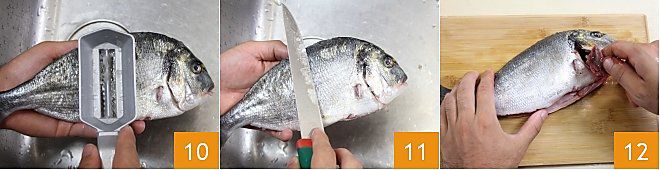 Com a ferramenta escaladora apropriada 10, ou com a lâmina de uma faca 11, escame cuidadosamente a dourada, passando repetidamente a ferramenta da cauda para a cabeça (recomendamos realizar esta operação sob água corrente, ou colocando o peixe em um saco, para evitar espalhar escamas por todo lado). Passe a dourada em água corrente, lavando-a cuidadosamente também por fora. Se você quiser cozinhar o peixe inteiro, no forno ou na grelha, a limpeza termina aqui e a dourada está pronta para ser temperada e cozida. Se, no entanto, você precisar de filés de dourada, coloque a dourada na tábua de corte e remova as guelras (situadas sob as duas aberturas semicirculares nos lados da cabeça), extraindo-as manualmente 12.