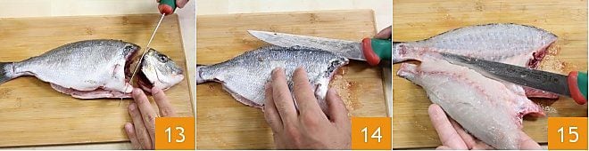 Com a faca para filetar peixe, faça um corte na cabeça e remova-a 13, depois faça um corte na cauda e na parte dorsal do peixe ao longo da coluna vertebral 14, começando de cima, e prossiga movimentando a lâmina horizontalmente em relação à superfície de trabalho, para obter o primeiro filé 15.