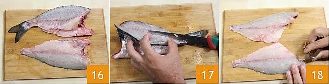 Agora separe as duas metades do peixe 16. Proceda da mesma forma, destacando a carne da espinha para obter o segundo filé (ao realizar esta operação, tome cuidado para não retirar muita polpa) 17. Remova todas as espinhas presentes utilizando uma pinça 18 (ajude-se passando uma mão sobre a polpa para identificá-las), depois retire a pele utilizando a faca com cuidado, para não desperdiçar a carne do peixe. Seus filés de dourada estão prontos para serem cozidos!