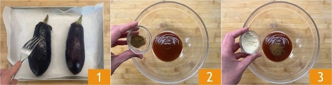 Para preparar a berinjela desfiada, primeiro coloque as berinjelas inteiras em uma assadeira forrada com papel manteiga, fure-as com um garfo 1 e asse em forno estático pré-aquecido a 250° por 35-40 minutos. Enquanto isso, prepare o molho: despeje o molho barbecue em uma tigela, depois adicione o cominho 2 e o alho em pó 3.
