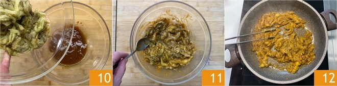 Adicione as berinjelas desfiadas ao molho 10 e misture bem 11. Transfira as berinjelas temperadas para uma frigideira antiaderente e salteie em fogo alto por cerca de 8 minutos, distribuindo uniformemente com pinças de cozinha 12: elas devem ficar bem glaceadas e tostadas.