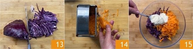 Por último, prepare a salada de repolho: corte em julienne com um mandoline o repolho roxo 13 e as cenouras 14. Junte os vegetais em uma tigela, tempere com maionese 15 e misture tudo.