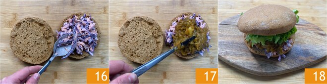 Você está pronto para montar os sanduíches: recheie a base com a salada de repolho 16, depois cubra com as berinjelas desfiadas ainda quentes 17 e uma folha de alface 18. Agora você está pronto para saborear a berinjela desfiada 18!