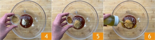 Adicione também o gengibre em pó 4 e a pimenta caiena 5, sal, pimenta e óleo 6.