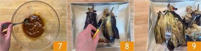 Misture para combinar os ingredientes 7. Quando as berinjelas estiverem cozidas, retire do forno e remova a casca com a ajuda de uma faca 8. Desfie a polpa das berinjelas usando um garfo 9.