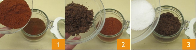 Para preparar o pulled pork, primeiro prepare o rub: pegue um pote grande e adicione a páprica doce e defumada 1, o açúcar mascavo 2 e o sal fino 3.