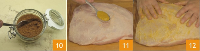 Misture bem todas as especiarias para obter uma mistura homogênea 10; se necessário, você pode peneirá-la. Agora pegue a paleta de porco, adicione a mostarda 11 e espalhe-a com as mãos por toda a superfície, tanto superior quanto inferior, para criar uma camada fina 12.