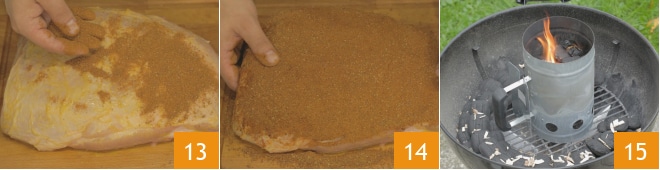 Depois, polvilhe a carne com o rub 13, certificando-se de cobri-la completamente 14. Enquanto isso, acenda o churrasco e ajuste para um cozimento indireto 15.