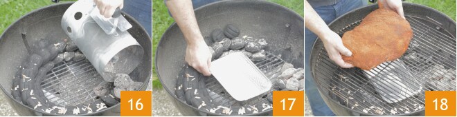 Coloque o carvão em uma metade do churrasco 16 e coloque na outra metade uma bandeja de alumínio que servirá para coletar os sucos da carne 17, depois posicione a paleta de porco na grelha na área sem calor direto 18.