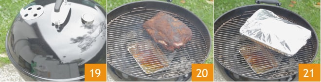 Ajuste as aberturas de ar para obter uma temperatura da câmara em torno de 150° e prossiga com a defumação 19. Cozinhe com a tampa por pelo menos algumas horas ou até que o rub forme uma crosta, o chamado bark 20. Neste ponto, transfira a carne para uma bandeja de alumínio e embrulhe tudo em papel alumínio. Coloque a bandeja no churrasco 21 e continue o cozimento por mais 6-8 horas, cuidando para que a temperatura da câmara permaneça em torno de 130°-150°. Você pode verificar se a carne está cozida medindo a temperatura interna que deve atingir 97°-98°.