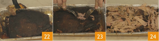 Após o tempo de cozimento, escorra o líquido de cozimento que se formou na bandeja e remova os ossos com um par de pinças de cozinha 22, depois desfie a carne usando simplesmente 2 garfos 23, deixando também alguns pedaços inteiros 24.
