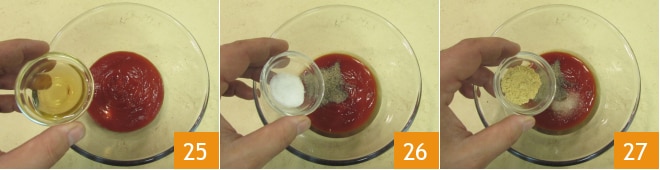 Prepare o molho: coloque o ketchup em uma tigela junto com o vinagre de maçã 25, pimenta, sal 26 e gengibre em pó 27.
