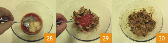 Misture bem 28 e adicione o molho obtido à carne desfiada 29. Misture para amalgamar o tempero de maneira uniforme 30.