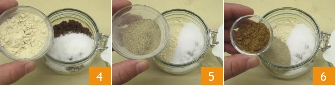Adicione também o alho em pó 4, a pimenta branca 5 e o coentro em pó 6.