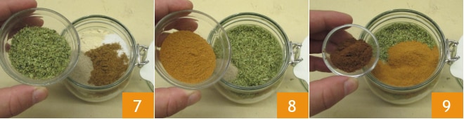 Por fim, adicione o orégano seco 7, a pimenta caiena 8 e o anis em pó 9.