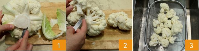 Para preparar o purê de couve-flor, comece pela limpeza dos legumes; vocês também podem consultar a Escola de Culinária: Como limpar couves e couve-flor. Com uma faquinha, elimine as folhas externas da couve-flor, corte o talo 1, depois separe as flores cortando na junção com o tronco principal 2; ao final, vocês devem obter cerca de 1,2 kg de couve-flor limpa. Lave bem as flores sob água corrente 3.
