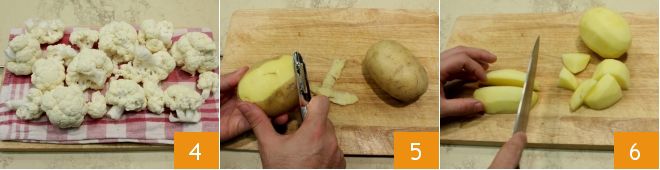 Deite-as sobre um pano de prato limpo 4 enquanto continua a preparação, descascando as batatas 5. Uma vez limpas, corte-as ao meio e depois em quartos 6.