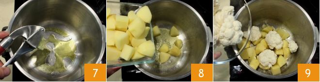 Pegue a panela de pressão, coloque um fio de azeite e meio dente de alho descascado e picado 7. Acrescente as batatas em pedaços 8 e as flores de couve-flor 9.