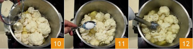 Agora coloque a água na panela de pressão 10, até o nível dos legumes. Em seguida acrescente uma colherinha rasa de sal grosso 11 ou tempere a gosto. Cozinhe a couve-flor e as batatas por 5 minutos, contando esse tempo a partir do apito da panela de pressão (se você não tiver panela de pressão, cozinhe os legumes em água fervente salgada em duas panelas separadas: levará cerca de 40 minutos; as batatas e as flores de couve-flor devem ficar macias). Passado o tempo necessário, quando os legumes estiverem cozidos e depois de liberar o vapor da panela, pegue o mixer de imersão e posicione-o na panela 12.