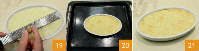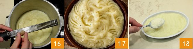 Agora rale a noz-moscada 16, depois decida como servir o purê: você pode transferi-lo simplesmente para uma terrina criando decorações com os dentes de um garfo 17; como alternativa, pode gratinar o purê assim: acrescente Grana ralado finamente 18,