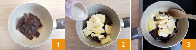Para preparar os quadradinhos de chocolate e gengibre, primeiro prepare a base: corte o chocolate em pedaços 1 e coloque-o em uma panela com a manteiga e 30 g de leite 2. Leve ao fogo e derreta em fogo baixo 3 mexendo com uma colher de pau.