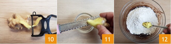 Descasque o gengibre fresco usando um descascador 10 ou uma faquinha e rale-o 11. Adicione-o à massa e misture 12.