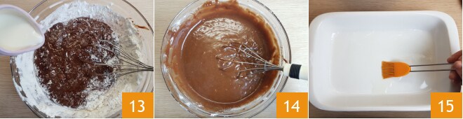 Por fim, adicione os 100 g de leite restantes 13 e misture muito bem, ainda usando o batedor manual, até obter uma massa lisa e homogênea 14. Pegue uma forma retangular de 30x20 cm e pincele com um pouco de óleo 15 apenas para aderir o papel manteiga.