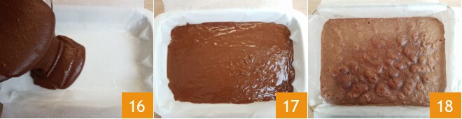 Forre a forma com o papel manteiga aderente, despeje a massa dentro 16, nivele com uma espátula 17 e asse no forno estático pré-aquecido a 170°C por 35 minutos. Faça o teste do palito, retire do forno e deixe esfriar 18.