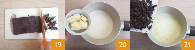 Enquanto isso, prepare a ganache de chocolate para cobrir o bolo. Pique o chocolate amargo 19. Despeje o creme de leite em uma panela e adicione a manteiga em pedaços 20. Aqueça em fogo médio até quase ferver. Retire do fogo e adicione o chocolate picado 21.