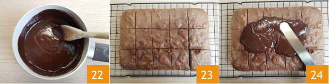 Misture tudo com vigor, para que o chocolate derreta completamente 22. Deixe esfriar por cerca de 30 minutos à temperatura ambiente, para que a cobertura ganhe consistência. Retire o bolo, desenforme removendo o papel manteiga e coloque-o sobre uma grade. Corte-o primeiro em três partes horizontalmente e depois em outras 5 partes no sentido vertical, obtendo 15 quadrados de cerca de 5 cm 23. Despeje a ganache por cima e espalhe por toda a superfície do bolo com a espátula 24.