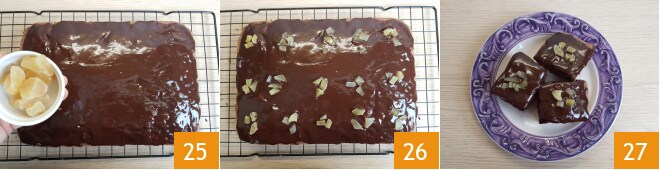 Decore cada quadradinho com pedaços de gengibre cristalizado 25 26. Coloque na geladeira por 30 minutos antes de servir os quadradinhos de chocolate e gengibre 27.