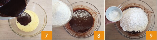 Adicione a mistura de chocolate e manteiga resfriada e misture 7. Adicione a farinha 8, o amido de milho e o fermento em pó 9.